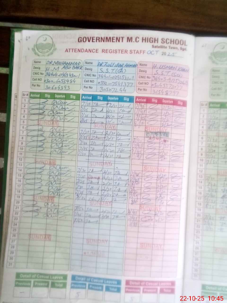 | CNIC | Full Name | Designation | R/C | Absence during last cal. month |