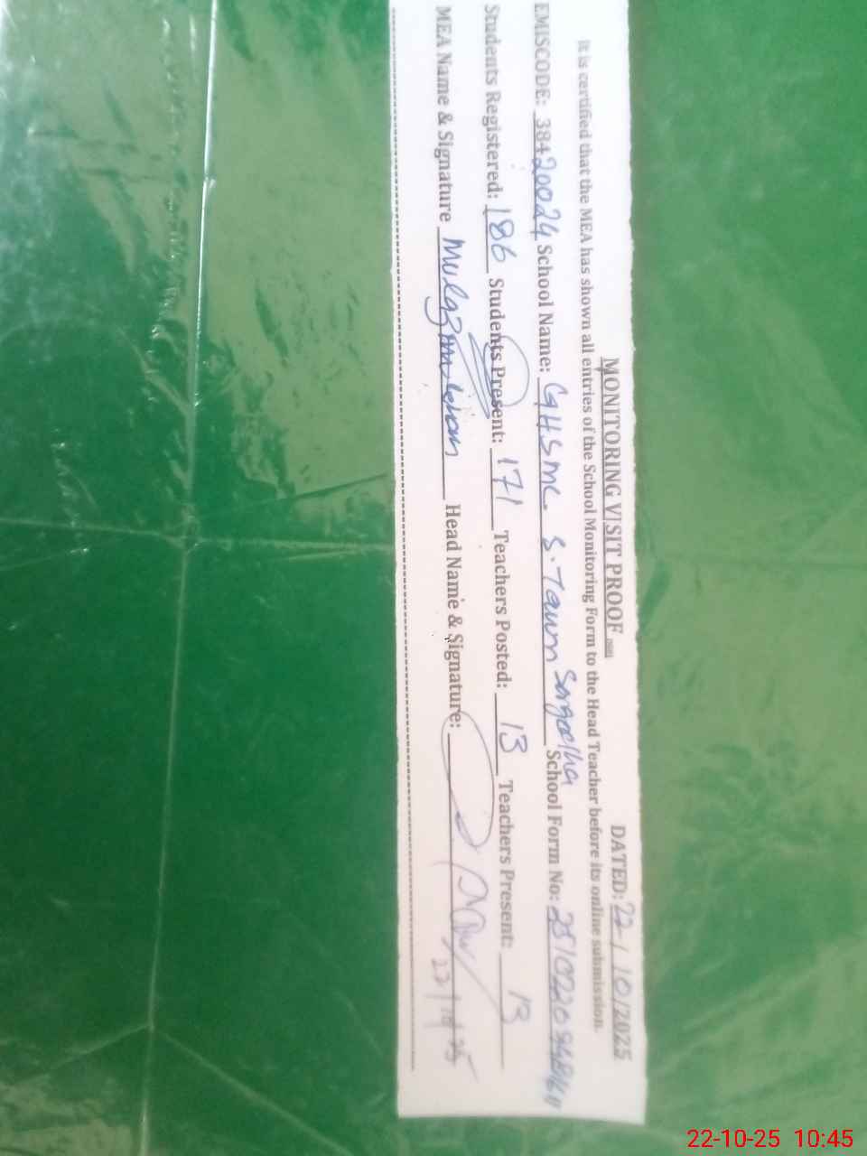 | Certified that this School was Inspected by the Undersigned MEA/DMO Today and the Information Stated Above is as Per Record. | |||||