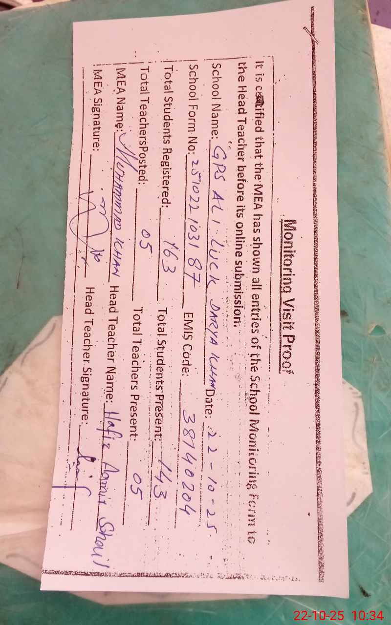 | EMIS Code: 38140204 | Name of School: GPS ALI LUCK DARAY KHAN | |||