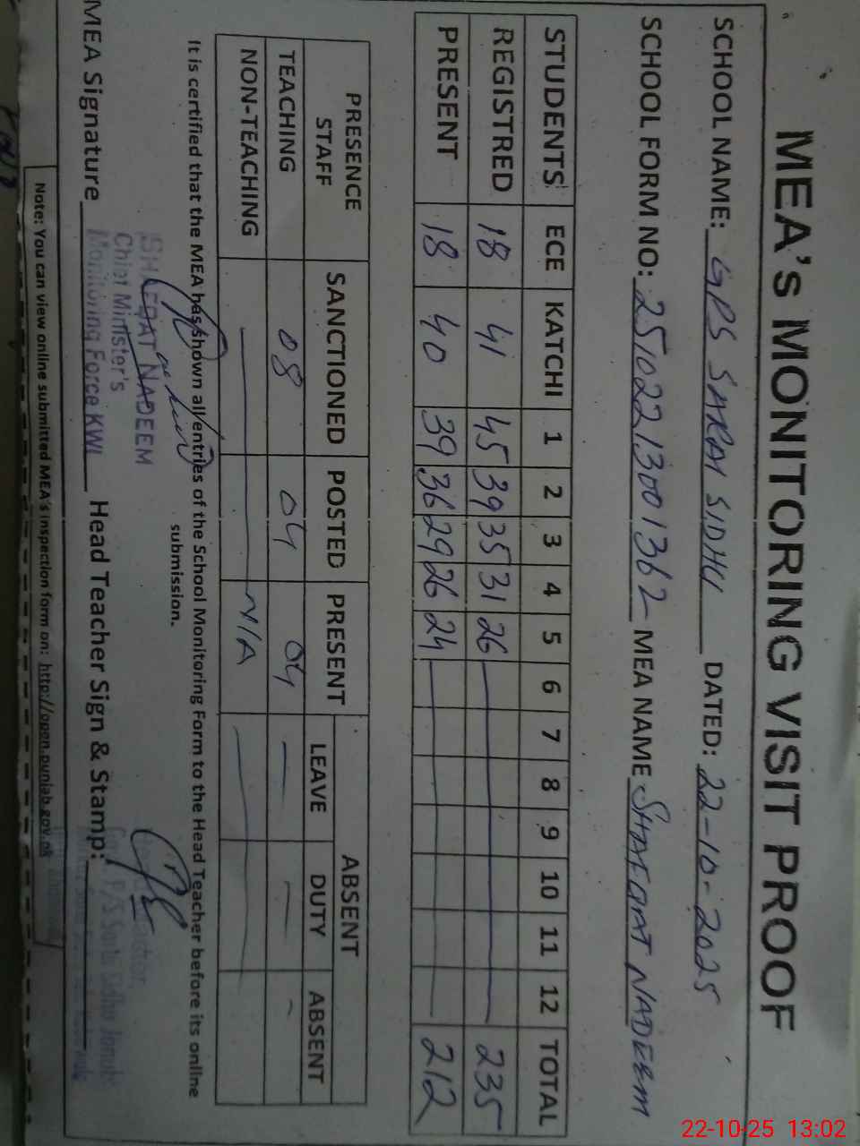| Attendance Register | Head Teacher | MEA with School | Visit Proof |