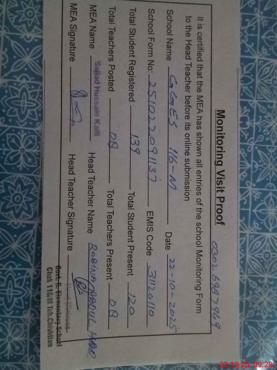 | EMIS Code: 31120110 | Name of School: GGES CHAK NO. 116/M | |||