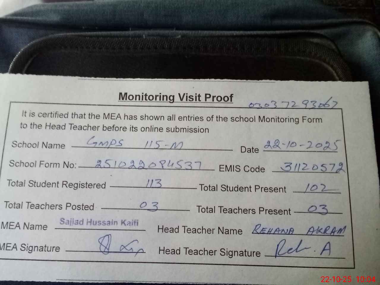 | Attendance Register | Head Teacher | MEA with School | Visit Proof |