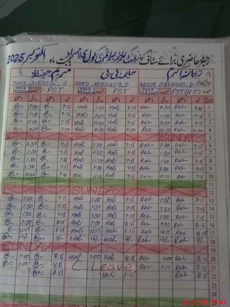 | CNIC | Full Name | Designation | R/C | Absence During Last Calender Month |