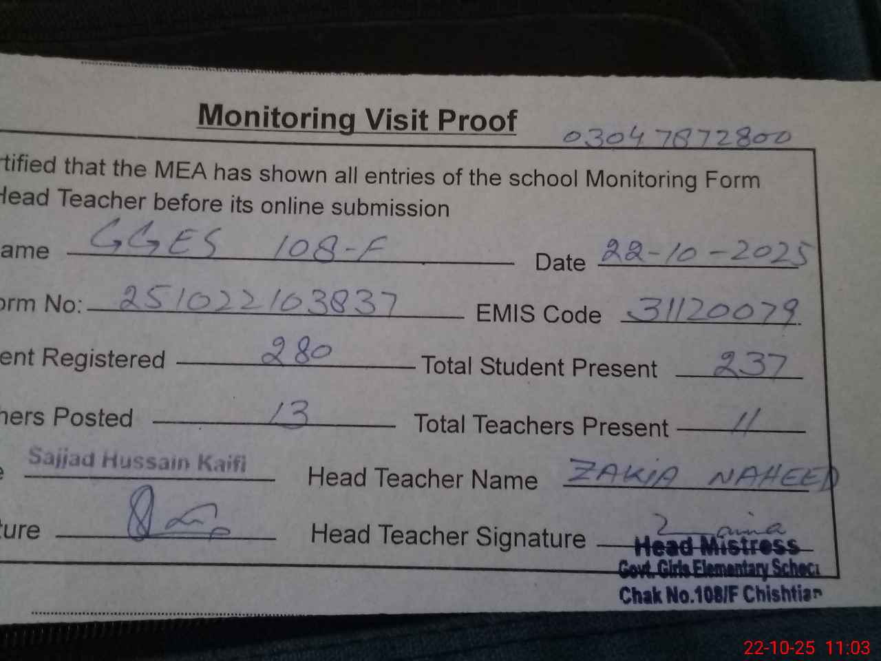 | Name: ZA**** NA**** Designation: (School Headmaster's/Headmistress's) S.S.T Phone/Cell Number: 03**** |