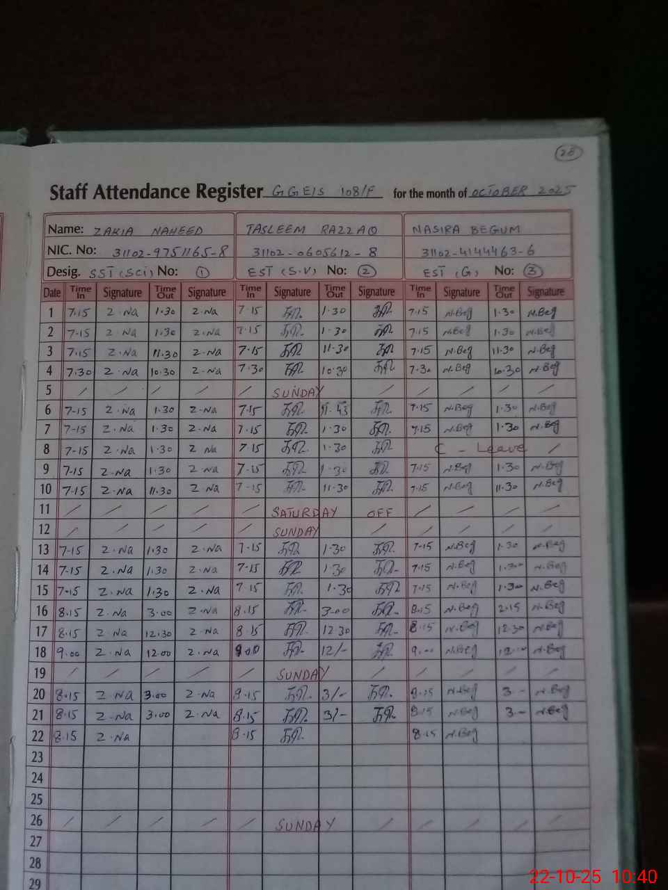 | CNIC | Full Name | Designation | R/C | Absence during last cal. month |