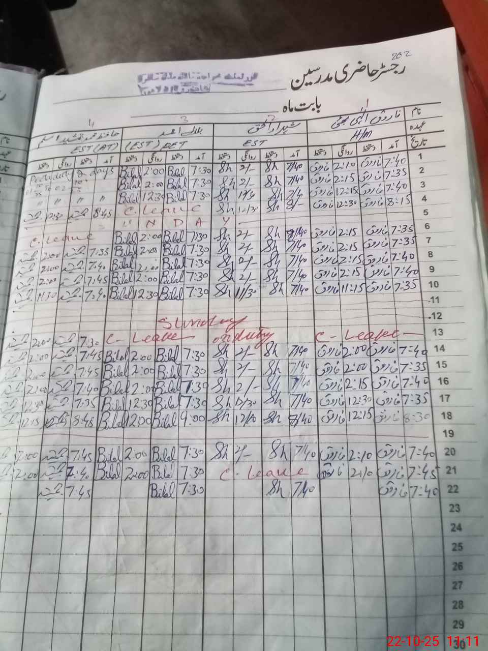 | CNIC | Full Name | Designation | R/C | Absence During Last Calender Month |