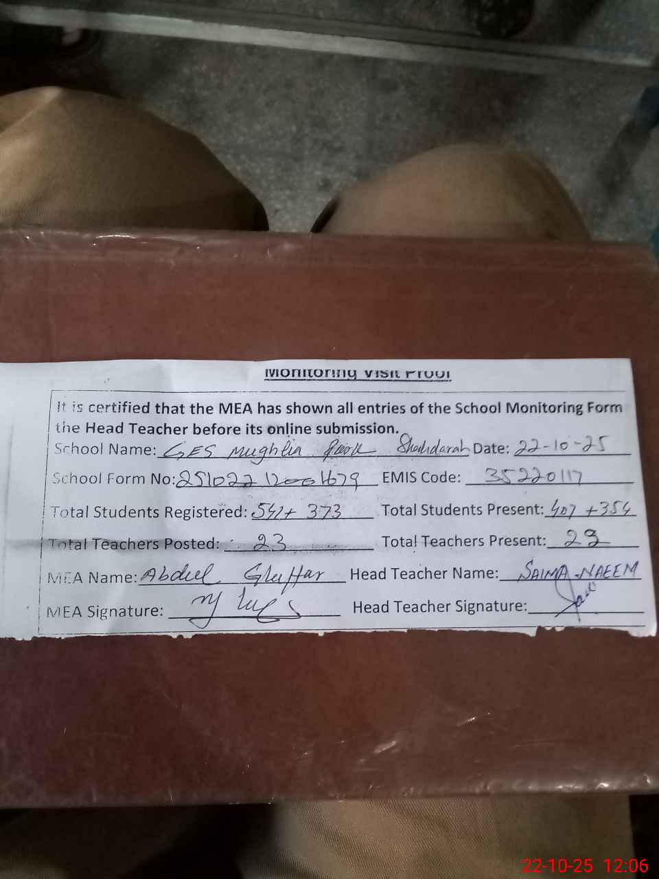 | EMIS Code: 35220117 | Name of School: GES MUGHLIA PARK SHAHDARA LAHORE | |||
