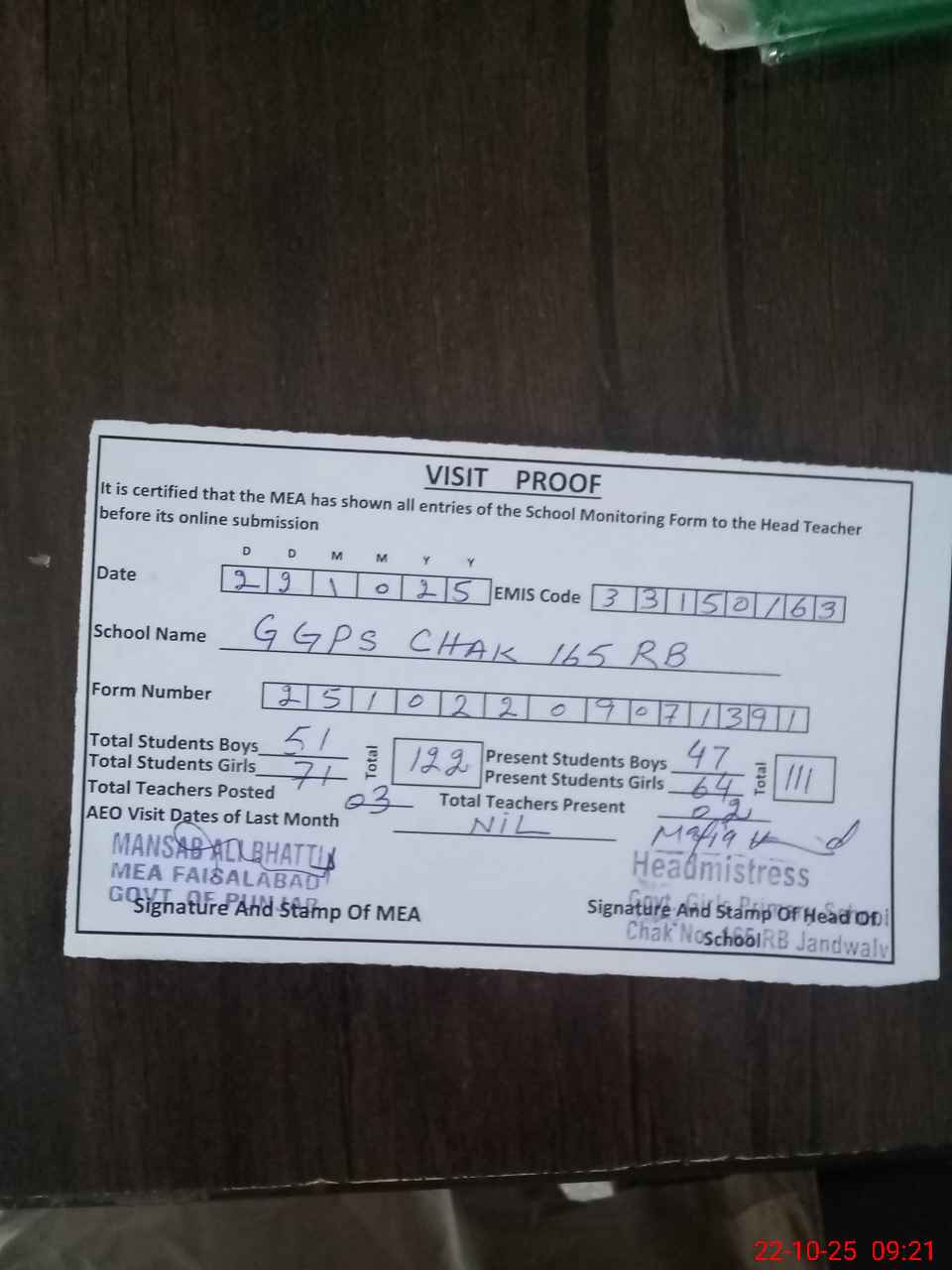 | Monitoring Date: 22-10-2025 | Start Time: 22-10-2025 08:51 AM | End Time: 22-10-2025 09:25 AM | Name of MEA: Ma**** Al**** | |