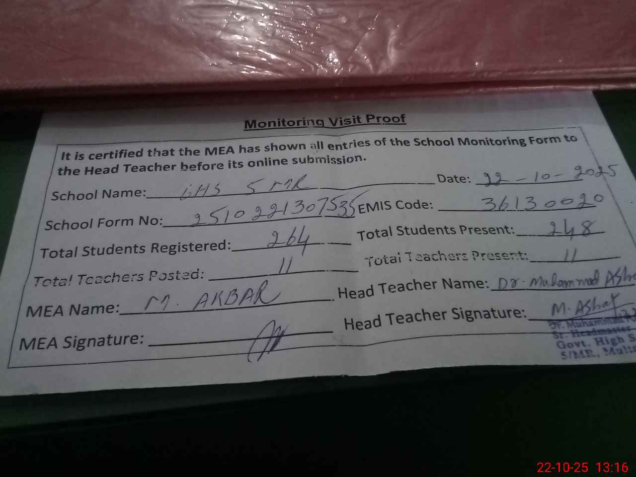 | EMIS Code: 36130020 | Name of School: GHS CHAK 5/MR P.O. MAKHDOOM RASHID MULTAN | |||