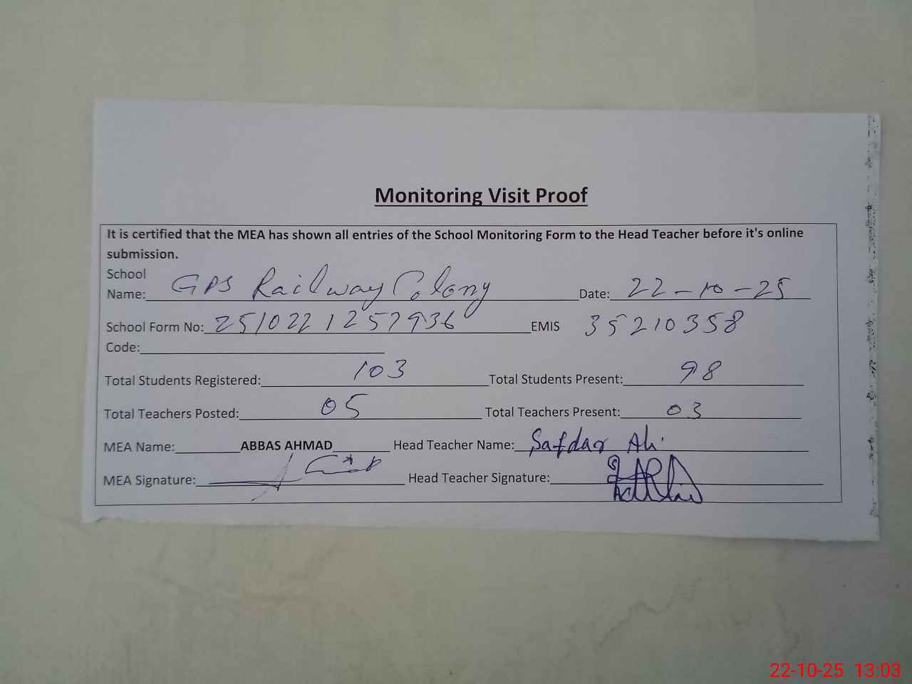 | EMIS Code: 35210358 | Name of School: GPS RAILWAY COLONY WALTON | |||