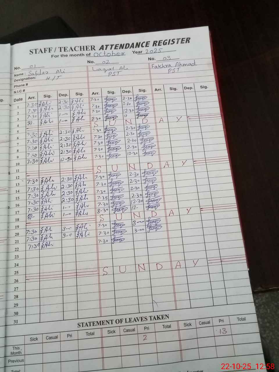 | CNIC | Full Name | Designation | R/C | Absence during last cal. month |