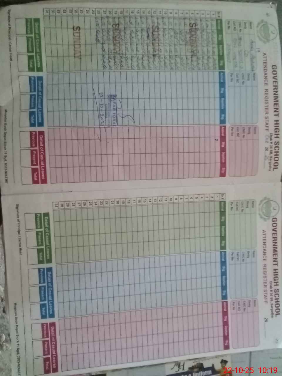 | CNIC | Full Name | Designation | R/C | Absence During Last Calender Month |