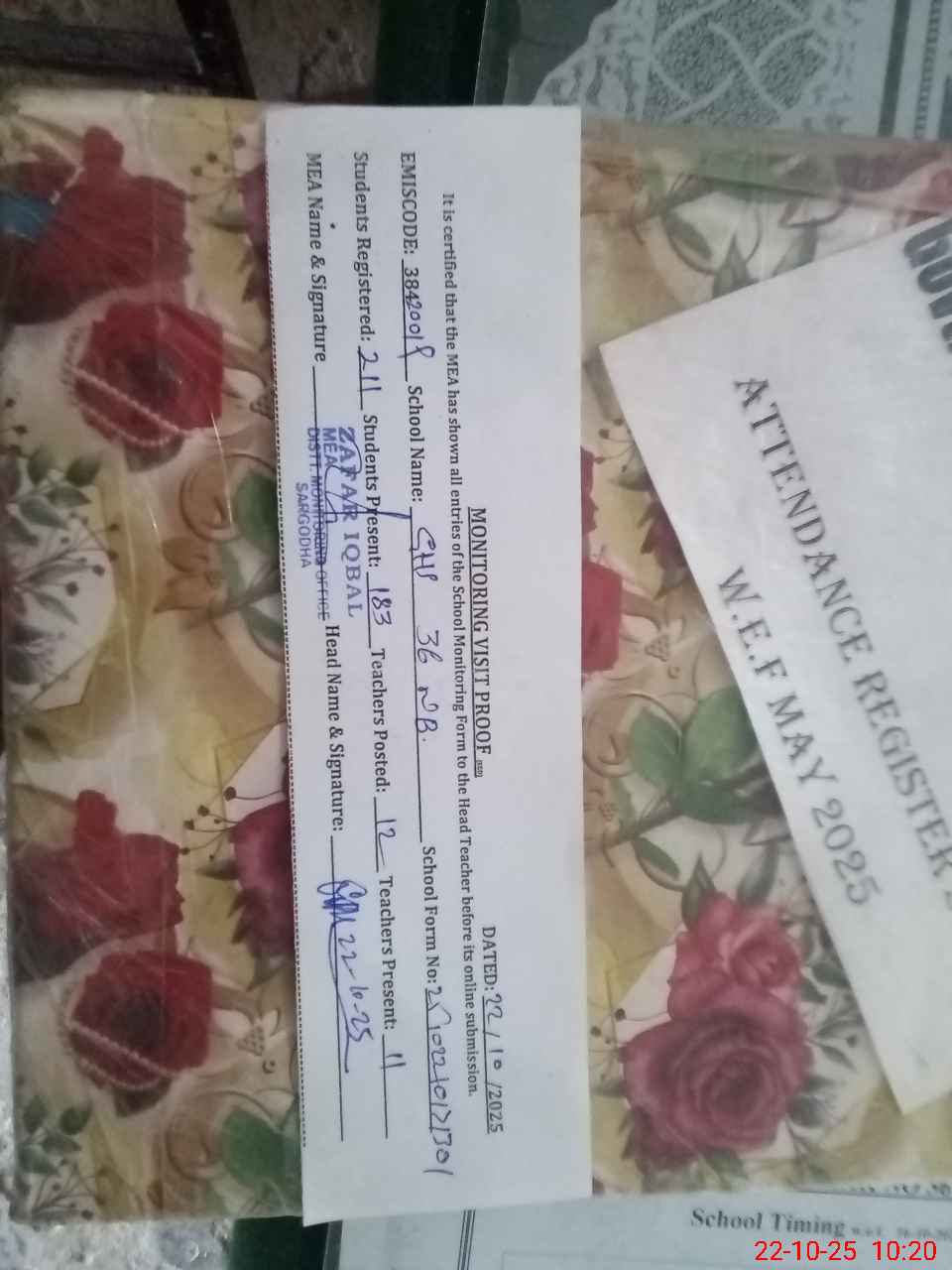 | Attendance Register | Head Teacher | MEA with School | Visit Proof |