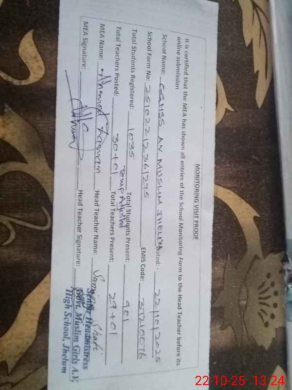 | EMIS Code: 37210076 | Name of School: GGHS AV MUSLIM JHELUM | |||