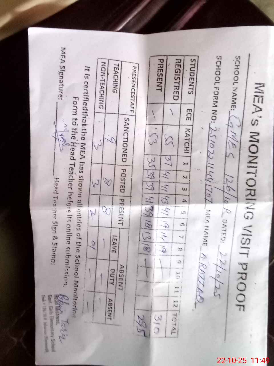 | Attendance Register | Head Teacher | MEA with School | Visit Proof |