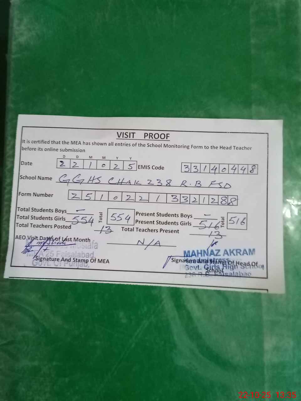 | EMIS Code: 33140448 | Name of School: GGHS CHAK 238 RB FSD | |||