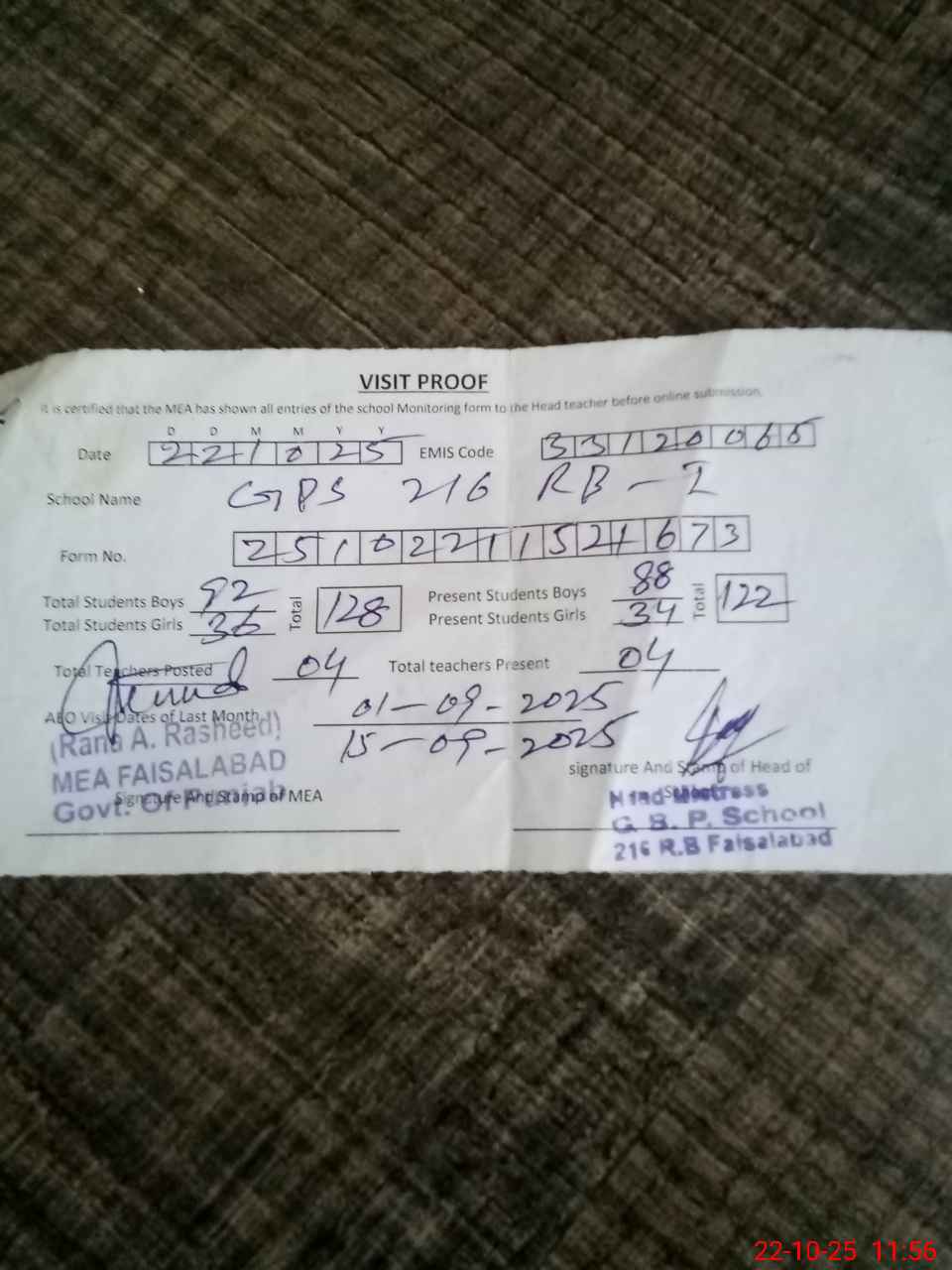 | EMIS Code: 33120065 | Name of School: GPS CHAK 216 RB | |||