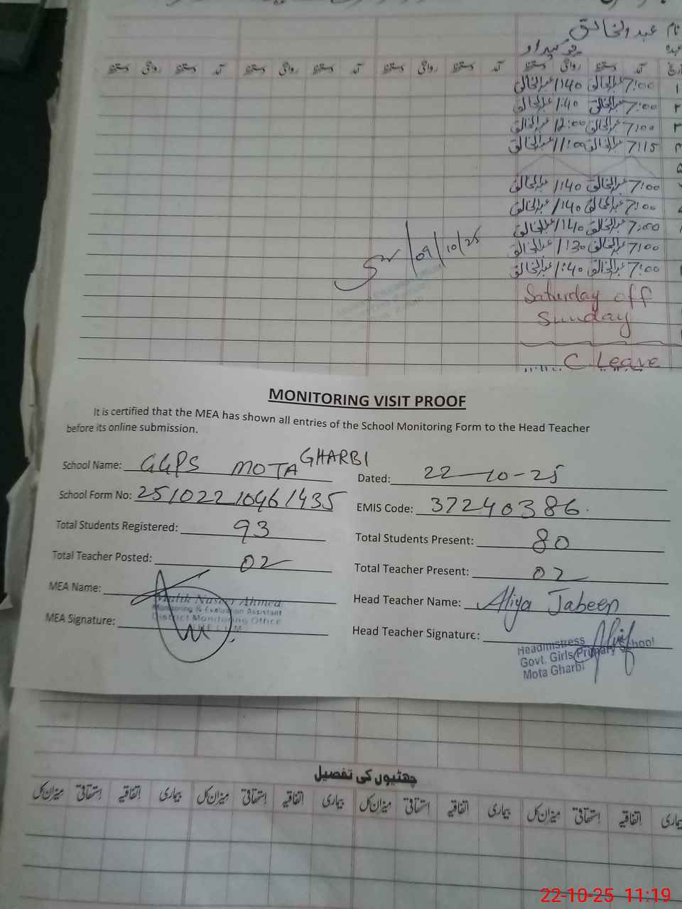 | Attendance Register | Head Teacher | MEA with School | Visit Proof |