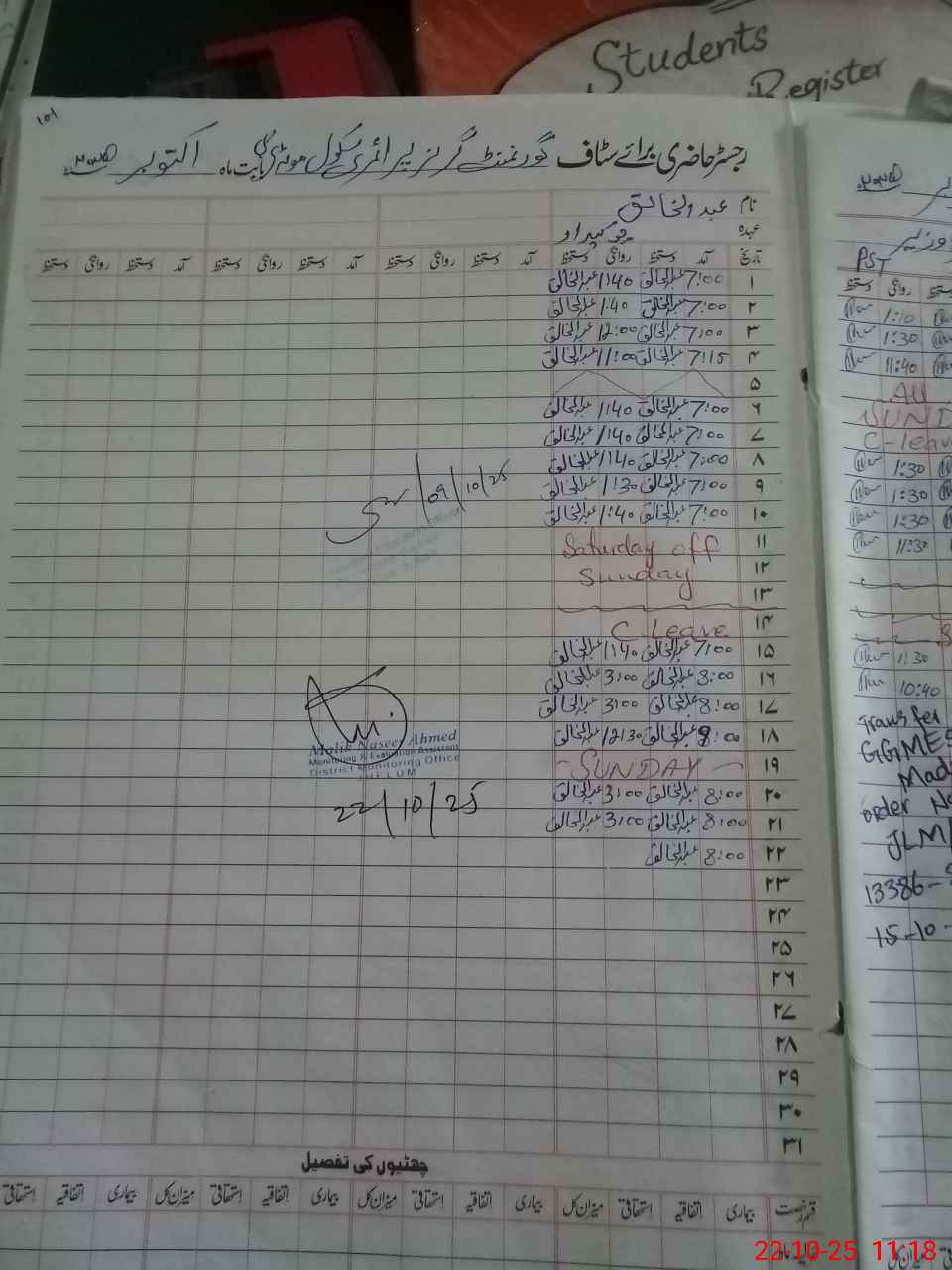 | CNIC | Full Name | Designation | R/C | Absence During Last Calender Month |