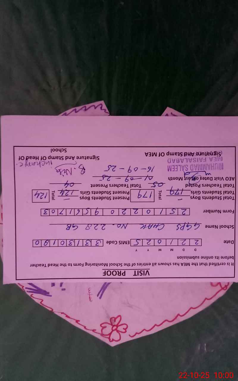 | Remarks (Use Separate Page if Required): HT KOUSAR PARVEEN PST MARKED ON CAUSUAL LEAVE BUT NO ONLINE LEAVE APPROVAL SO MARKED AS UNAUTHORIZED ABSENT NO LND MATERIAL 01XCLASSROOM DANGEROUS USED FOR TEACHING ATTENDANCE 124 OUT OF 179 PST MNOBIA KHALID DIED SINCE 27MAY 2025 BUT STILL PRESENT IN SCHOOL TAB | |||||