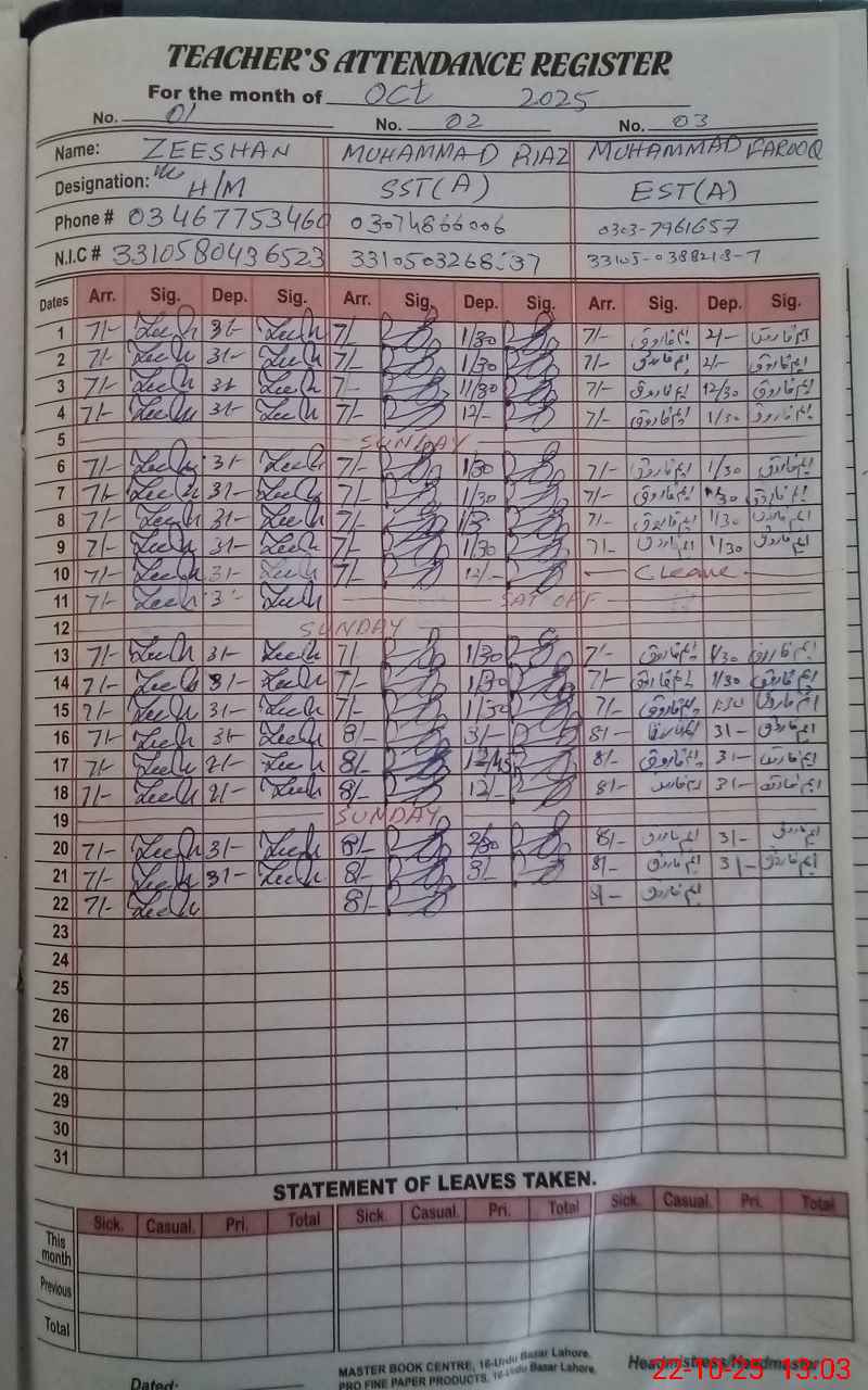 | Name: ZE**** Designation: (School Headmaster's/Headmistress's) SST (I T) Phone/Cell Number: 03**** |