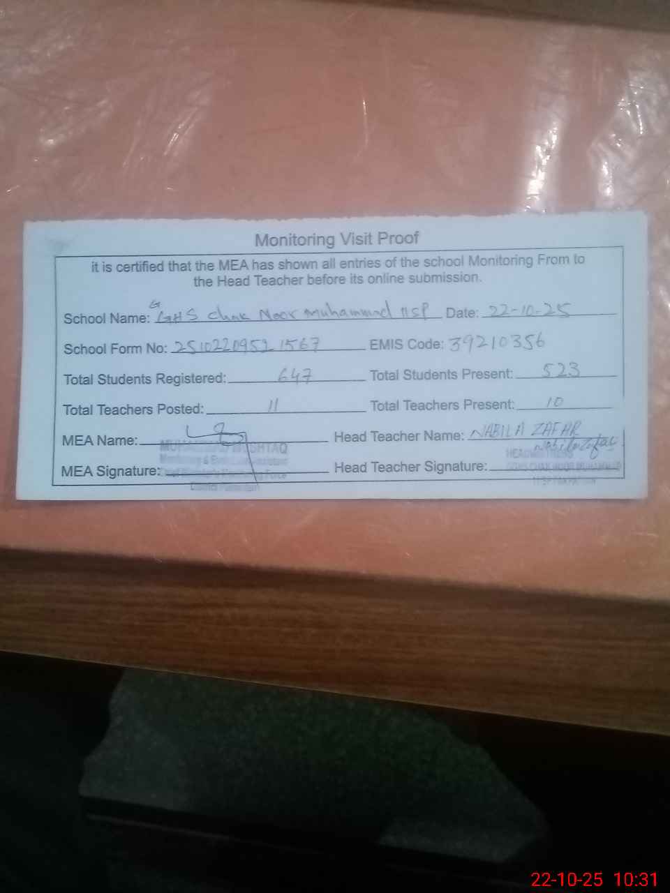 | Certified that this School was Inspected by the Undersigned MEA/DMO Today and the Information Stated Above is as Per Record. | |||||