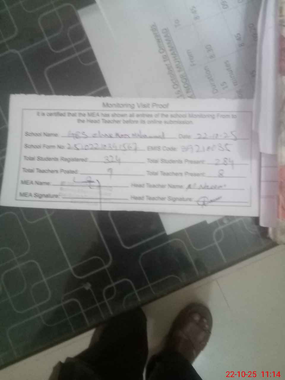 | Attendance Register | Head Teacher | MEA with School | Visit Proof |