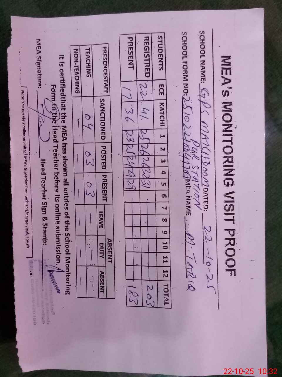 | Attendance Register | Head Teacher | MEA with School | Visit Proof |