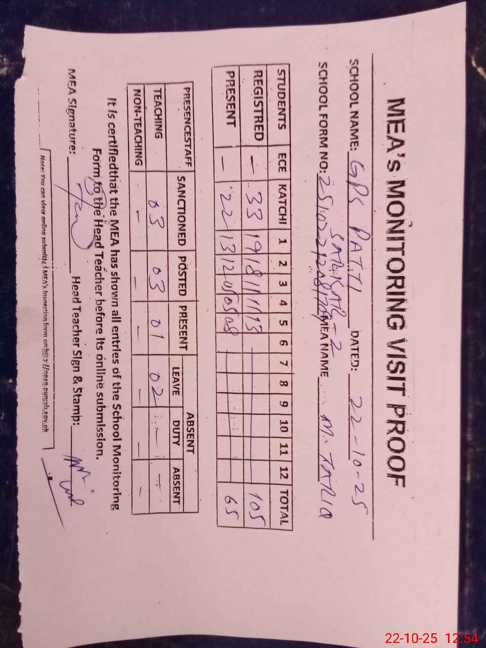 | Attendance Register | Head Teacher | MEA with School | Visit Proof |