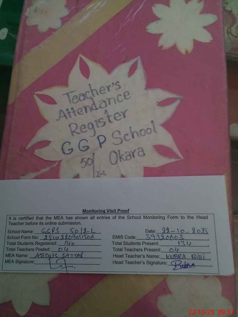 | Attendance Register | Head Teacher | MEA with School | Visit Proof |