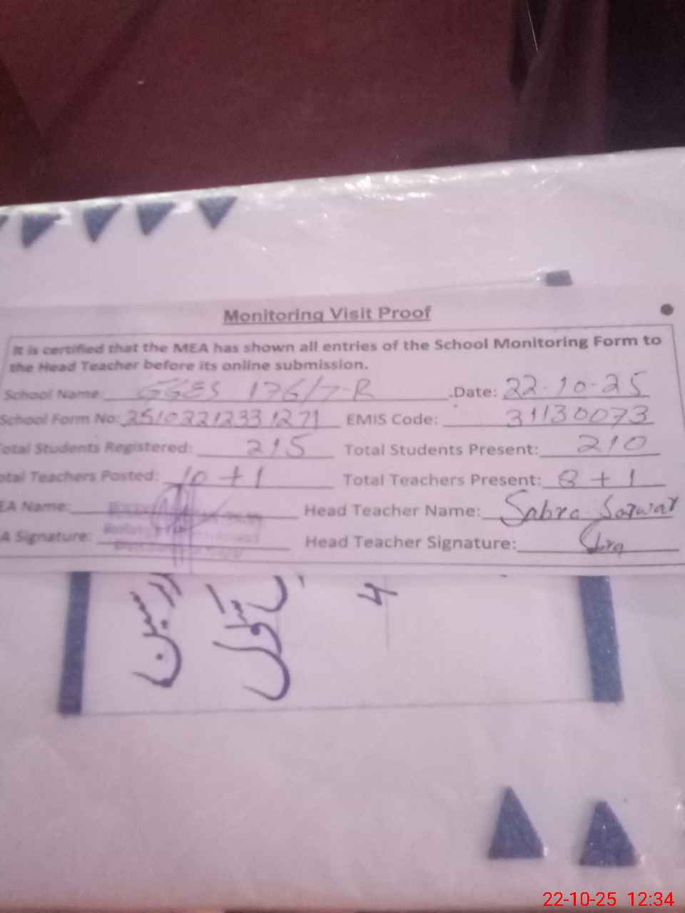 | Attendance Register | Head Teacher | MEA with School | Visit Proof |