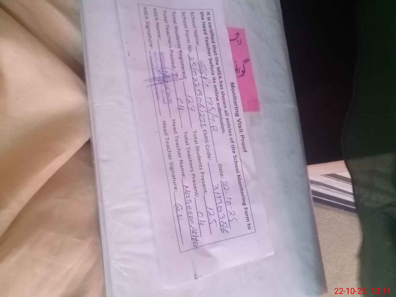 | Attendance Register | Head Teacher | MEA with School | Visit Proof |