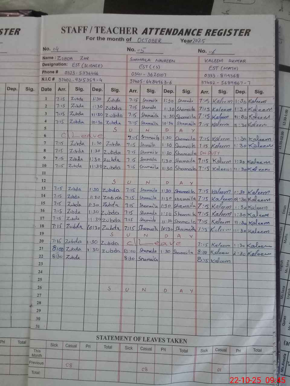 | CNIC | Full Name | Designation | R/C | Absence during last cal. month |