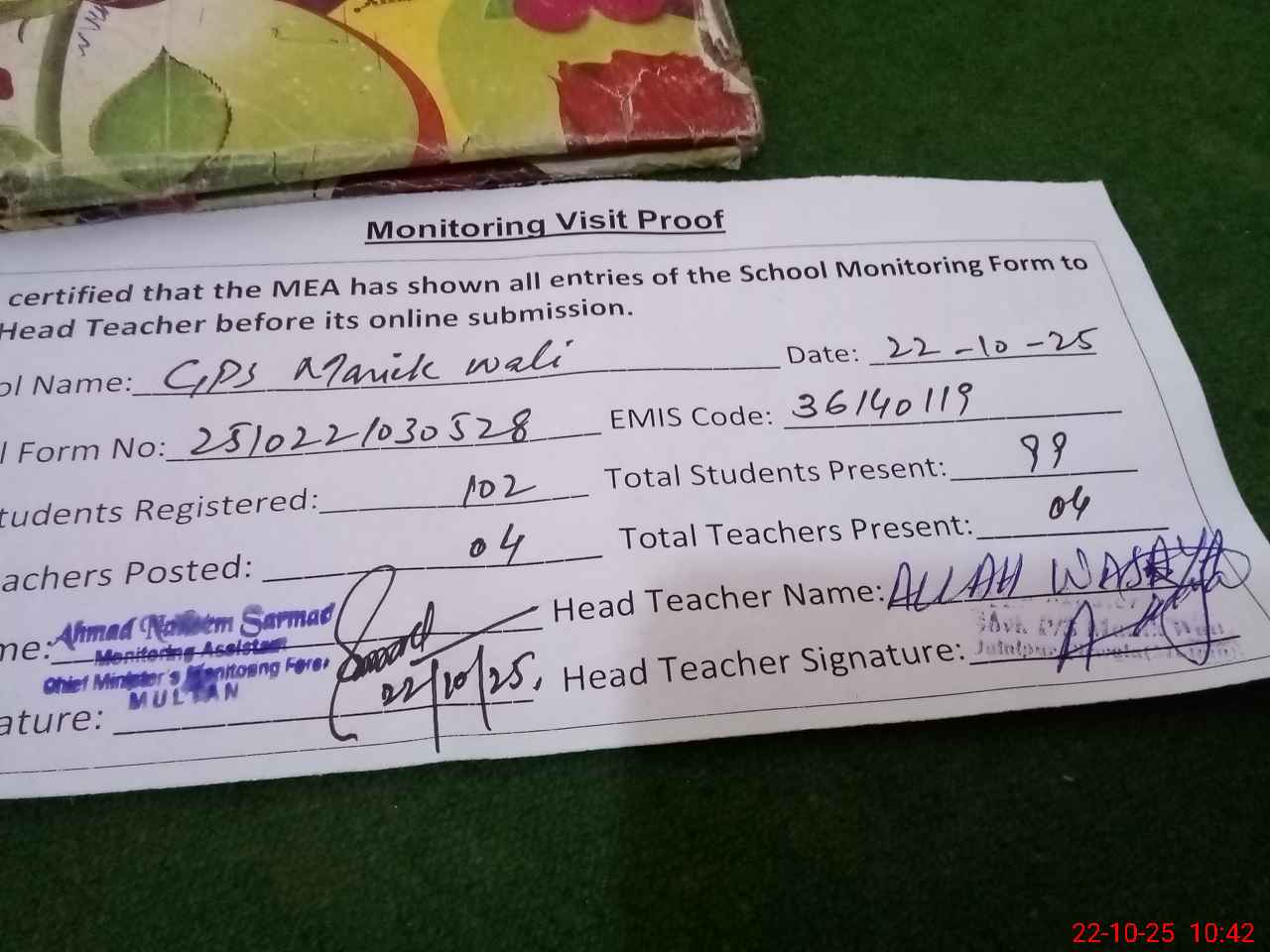 | Attendance Register | Head Teacher | MEA with School | Visit Proof |