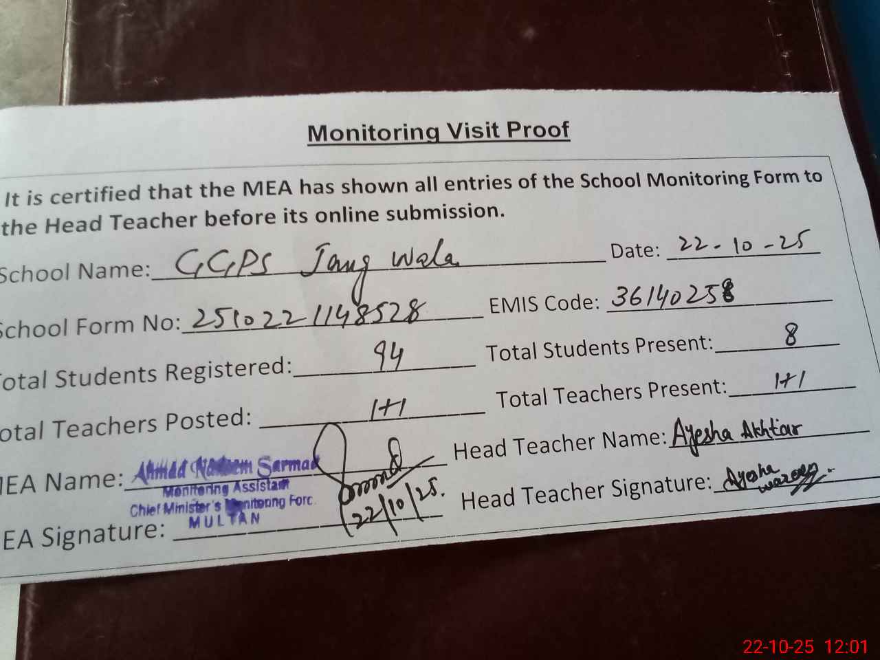 | Attendance Register | Head Teacher | MEA with School | Visit Proof |