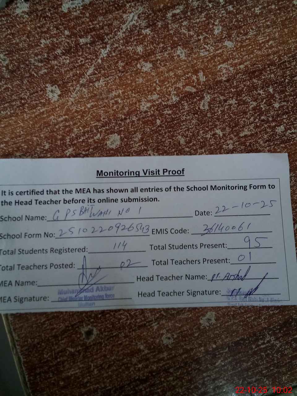 | EMIS Code: 36140061 | Name of School: GPS BAIT WAHI NO.1 | |||