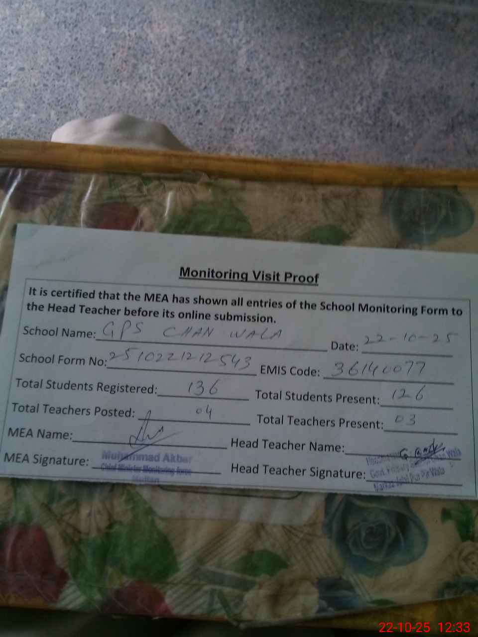| Attendance Register | Head Teacher | MEA with School | Visit Proof |