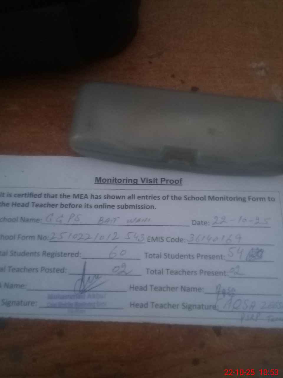 | Attendance Register | Head Teacher | MEA with School | Visit Proof |