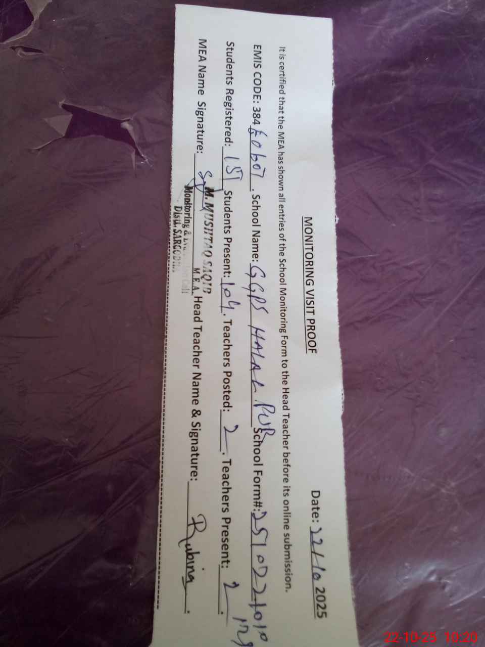 | Attendance Register | Head Teacher | MEA with School | Visit Proof |