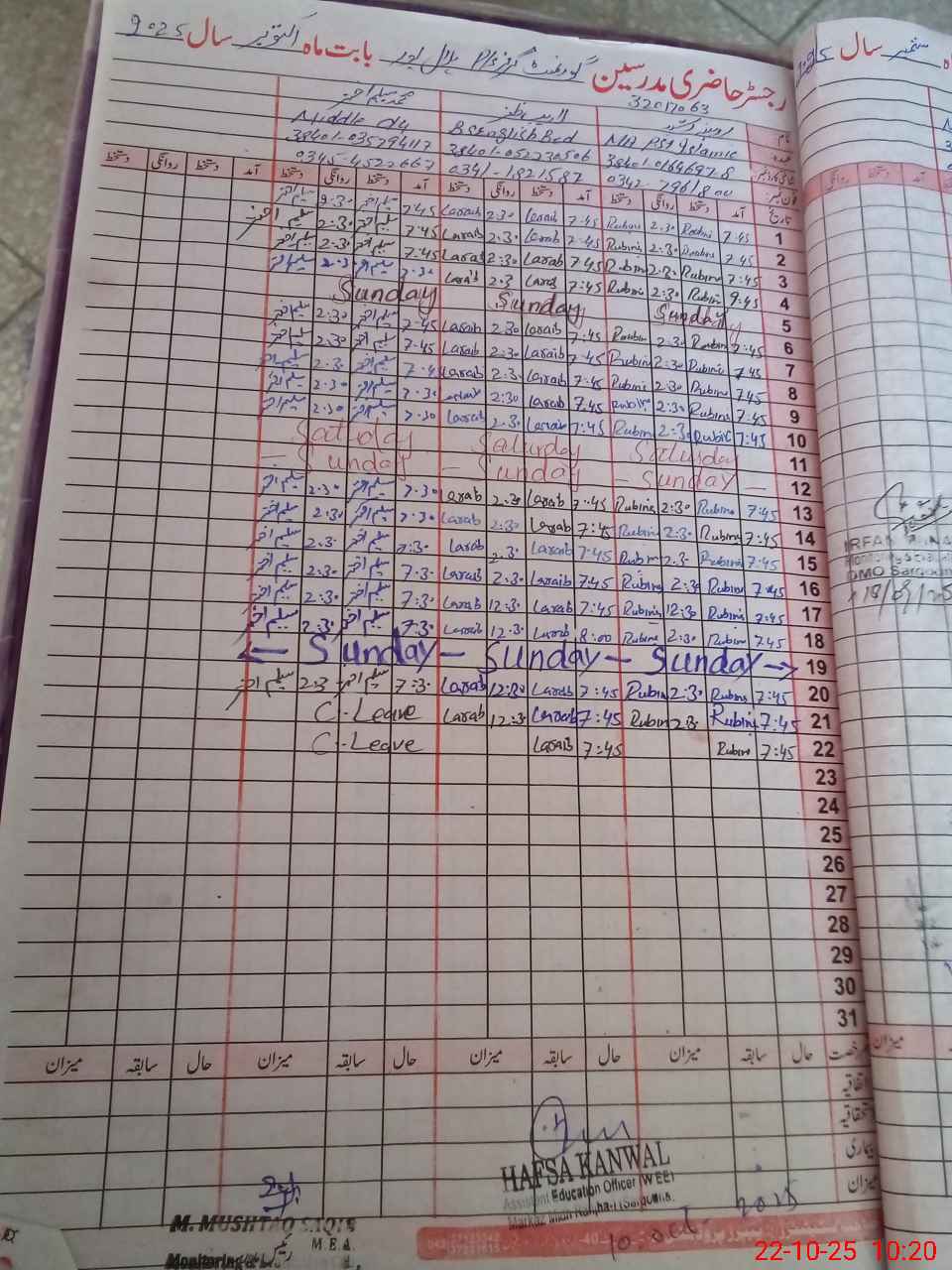 | CNIC | Full Name | Designation | R/C | Absence During Last Calender Month |