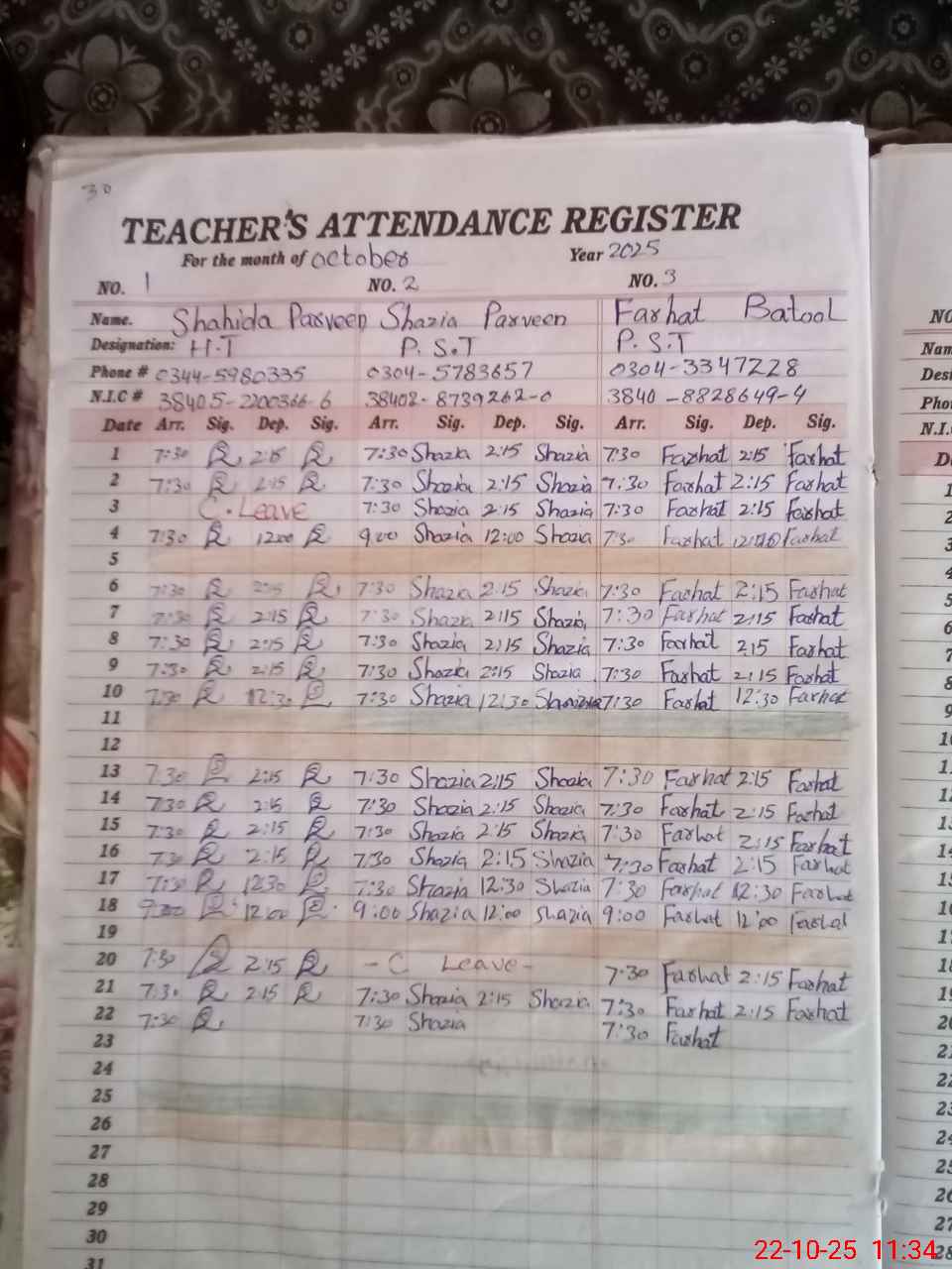 | CNIC | Full Name | Designation | R/C | Absence during last cal. month |