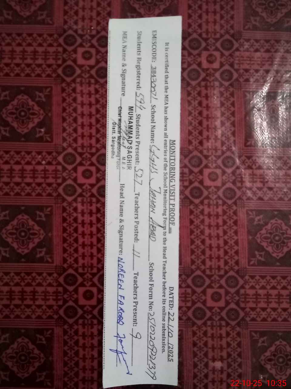 | Certified that this School was Inspected by the Undersigned MEA/DMO Today and the Information Stated Above is as Per Record. | |||||