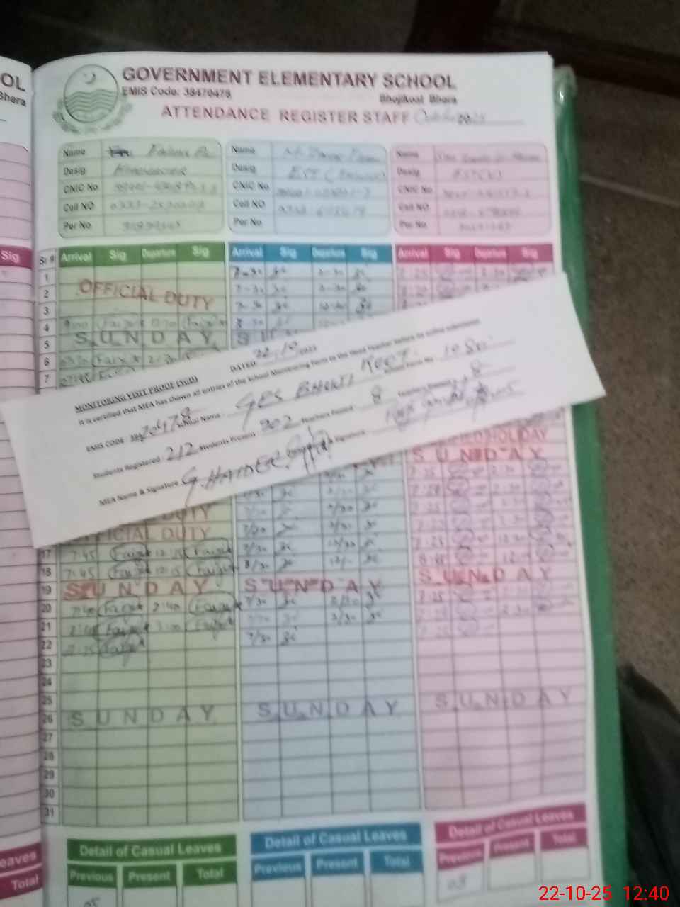 | CNIC | Full Name | Designation | R/C | Absence during last cal. month |