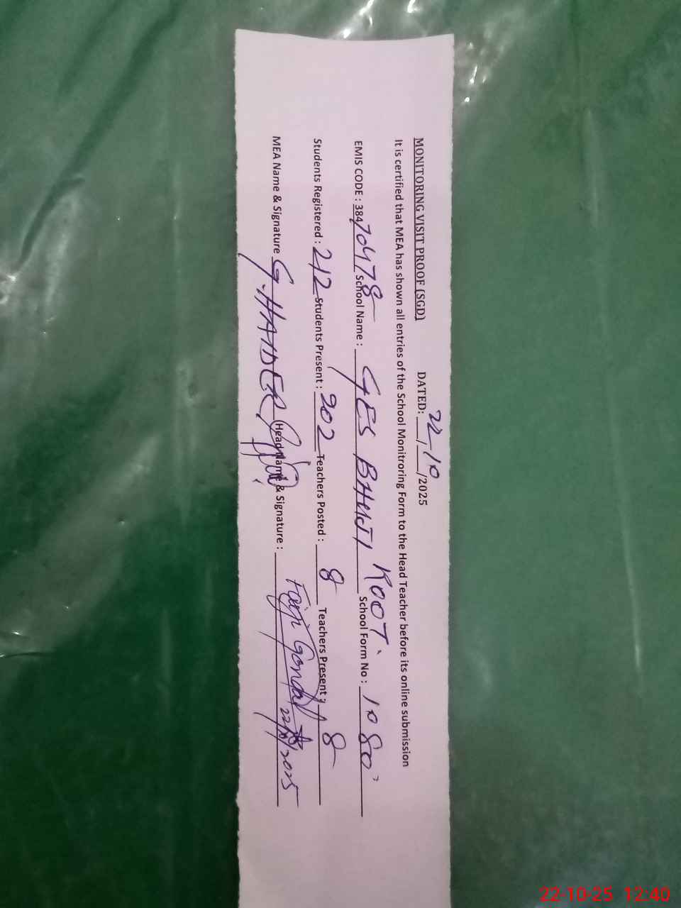 | Certified that this School was Inspected by the Undersigned MEA/DMO Today and the Information Stated Above is as Per Record. | |||||