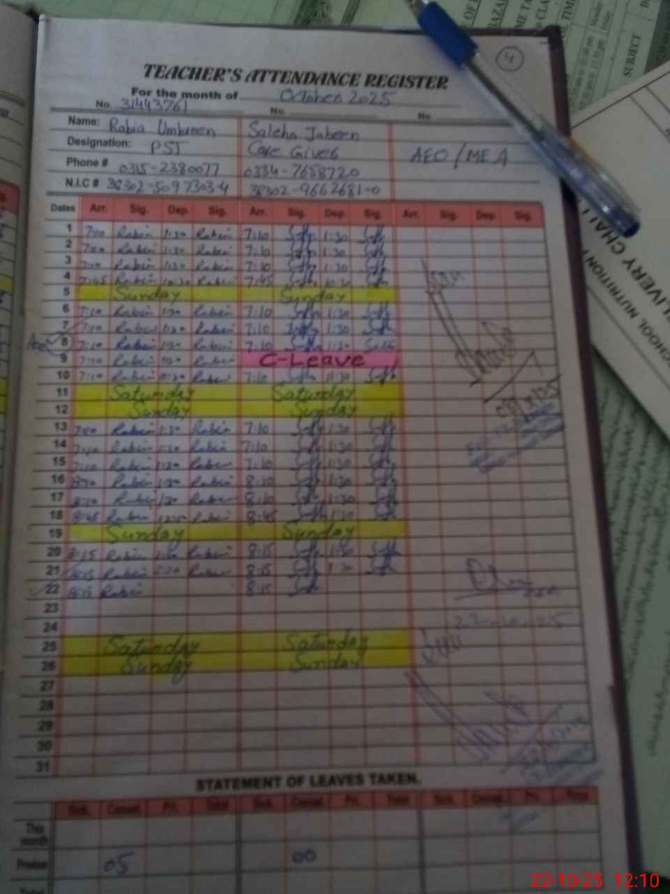 | CNIC | Full Name | Designation | R/C | Absence During Last Calender Month |
