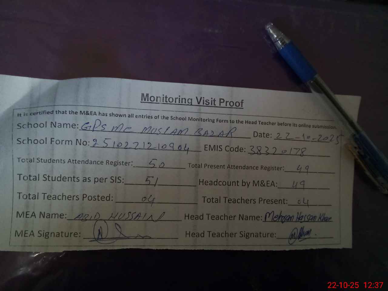 | Attendance Register | Head Teacher | MEA with School | Visit Proof |