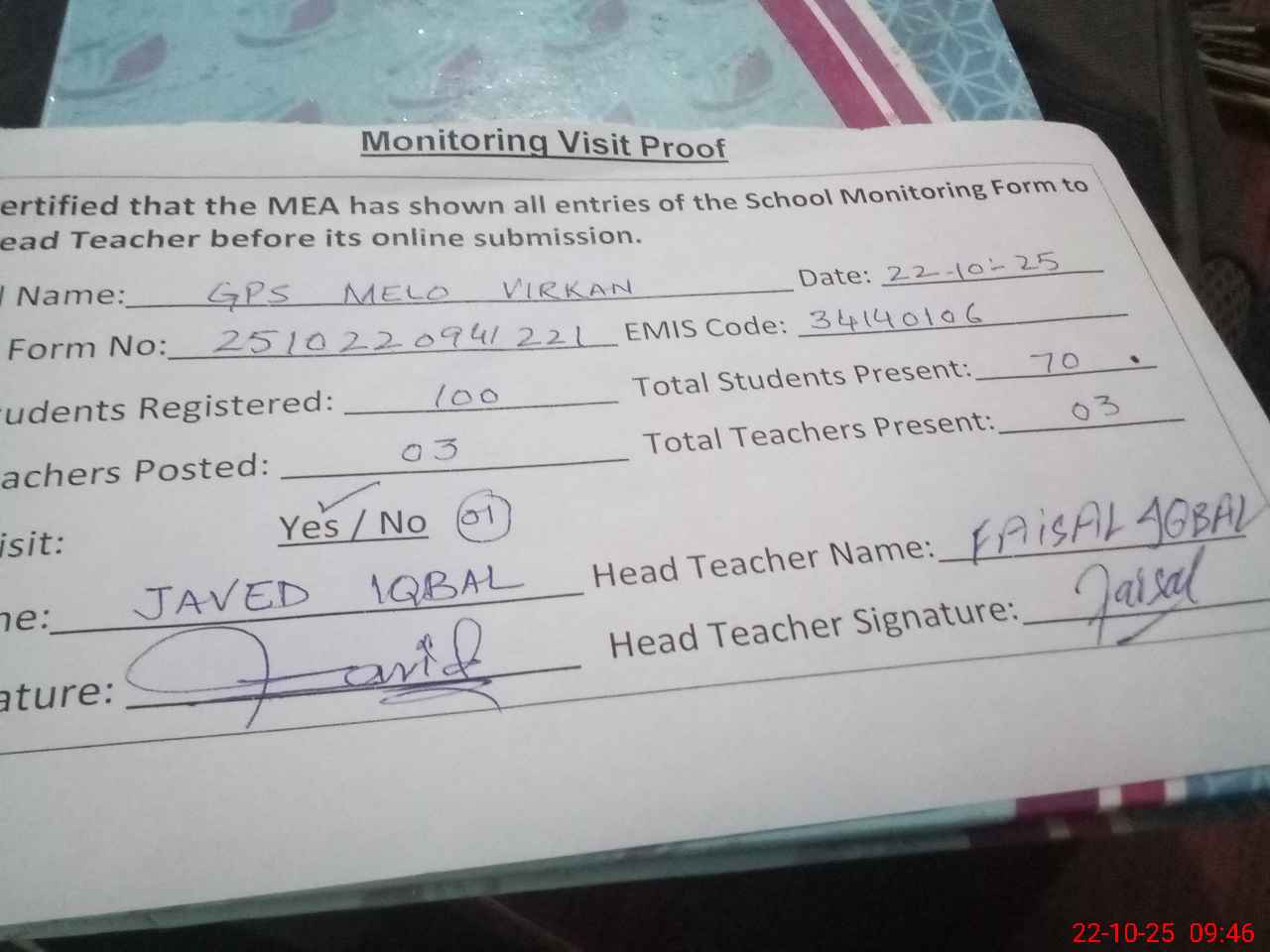 | Attendance Register | Head Teacher | MEA with School | Visit Proof |