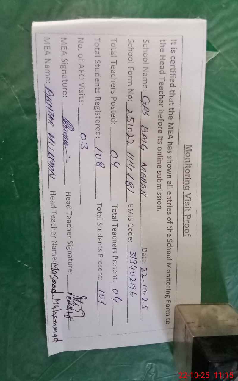 | EMIS Code: 31340296 | Name of School: GPS BAIG MEHAR | |||