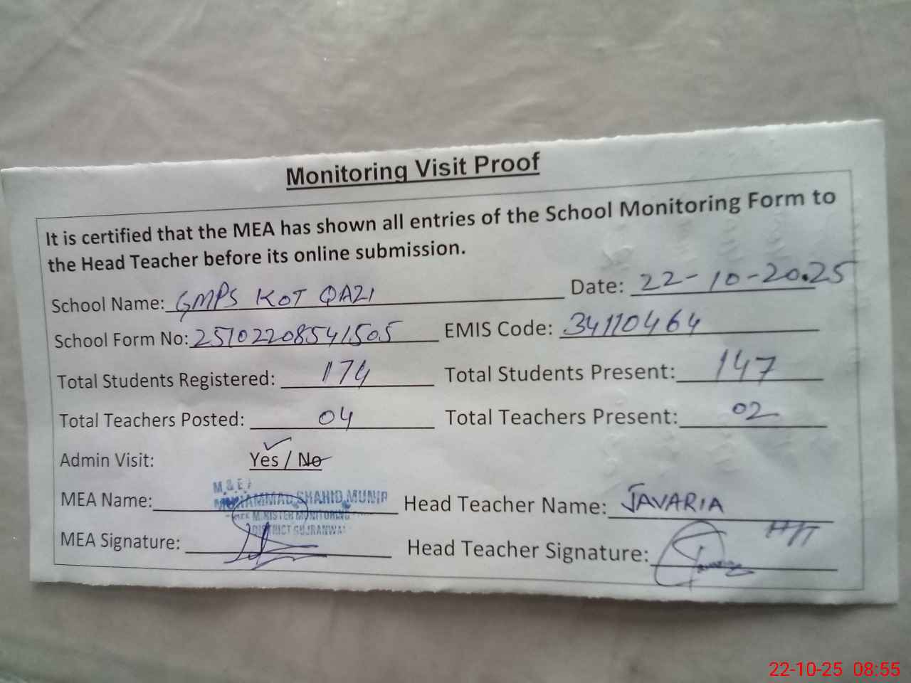| Attendance Register | Head Teacher | MEA with School | Visit Proof |