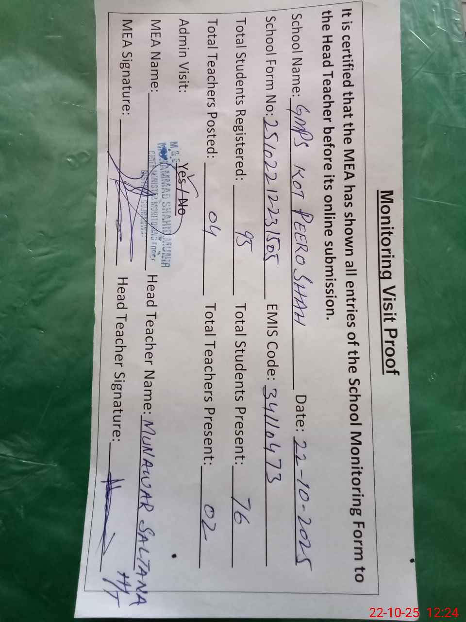 | Attendance Register | Head Teacher | MEA with School | Visit Proof |